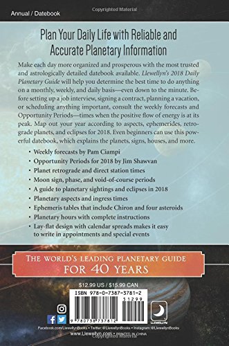 Make each day more organized and prosperous with the most trusted and astrologically detailed datebook available. Llewellyn’s 2018 Daily Planetary Guide will help you determine the best time to do anything on a monthly, weekly, and daily basis―even down to the minute. Before setting up a job interview, signing a contract, planning a vacation, or scheduling anything important, consult the weekly forecasts and Opportunity Periods―times when the positive flow of energy is at its peak. Map out your year according to aspects, ephemerides, retrograde planets, and eclipses for 2018. Even beginners can use this powerful datebook, which explains the planets, signs, houses, and more.